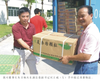 2009年8月18日,在東源縣縣委副書記劉立威的帶領(lǐng)下,東源縣總工會(huì)“關(guān)愛健康,送清涼”行動(dòng)小組為我司送上了菊花茶、夏桑菊等一批消暑降溫物品。行動(dòng)小組受到了我司董事長(zhǎng)朱日楊等人的熱情接待,朱董事長(zhǎng)認(rèn)為,“送清涼”行動(dòng)充分體現(xiàn)了上級(jí)領(lǐng)導(dǎo)部門對(duì)企業(yè)員工貼心的關(guān)懷,并代表全體‘霸王花’人對(duì)此表示衷心地感謝。